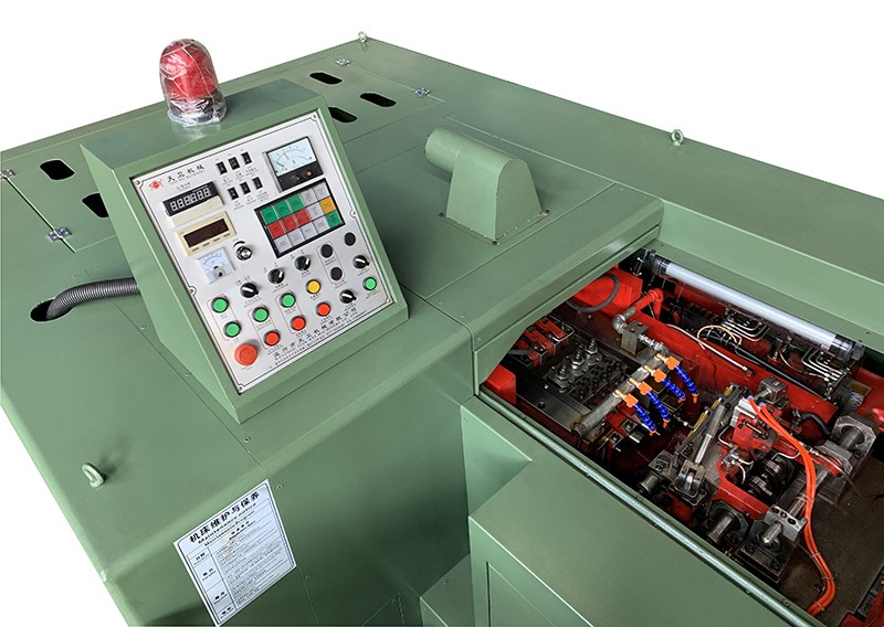 Suitable for forming various non-standard screw bolts, auto parts, motorcycle parts, engineering machinery parts, electrical accessories, etc! The main sliding block is connected with the rear wing design to make it travel more stable and accurate. The JIS FCD55 independent forward stroke adjustment mechanism is used. The die base is made of alloy steel shell, and the inner bushing is made of SKD-11 material, which can improve the accuracy and prolong the service life. 1. This machine part adopts strict casting process and is treated to eliminate residual stress to prevent deformation during use and maintain the high accuracy of machine parts for a long time 2. Equipped with air pressure clutch brake, the starting current of the machine can be low, and the "inching", "single stroke" and "continuous stroke" can be realized. Except for the "inching" mode, the main slider of the machine will automatically stop at the rear position when parking, so as to provide operation and adjustment space 3. The circumferential cutting die can ensure the material cutting section is neat and flat 4. The pressing wheel and the pressing pawl are driven by the air cylinder. The pressing wheel is equipped with an anti retreat device to prevent the material from retreating. 5. The forward ejection (male die ejection) action synchronized with the main slider can make the workpiece temporarily stay in the female die after forming to avoid being taken out by the die. 6. The main motor is equipped with an imported frequency converter PLC control system to achieve stepless speed regulation of the machine's production speed 7. The cams of all parts are accurately calculated and designed by computer and manufactured by CNC machine tools, thus greatly improving the accuracy and stability of machine operation 8. The strong lathe bed and quenched alloy steel side plate can keep the main sliding table moving accurately for a long time and extend the service life of the mold. 9. The automatic safety detection device can automatically detect the working status and fault display of the main mechanisms of the machine, such as the high and low short material oil pressure, the high and low engine overload, the front and rear support overload, etc 10. It is very convenient for users to adjust the phase of side cam when trimming or forming bolts are produced
